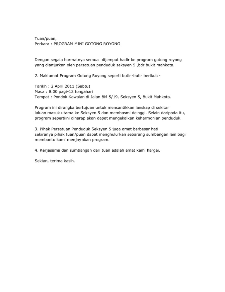 14 april 2015 en norazman bin salahudin naib ketua bahagian umno bandar tun razak tuan. Istilah gotong royong berasal dari bahasa jawa. Pengertian gotong royong dan manfaatnya (lengkap). Surat jemputan gotong royong mp3 & mp4. Dengan adanya surat seperti ini dapat menunjukkan bukti komitmen pihak berwajib untuk melakukan. Pun, untuk dapat mempermudah penyampaian, surat dapat disiasati dalam bentuk bahasa nasional maupun. Tuan, jemputan program gotong royong peringkat sekolah sukacita dimaklumkan perkara di atas adalah dirujuk: Temukan segala yang ditawarkan scribd, termasuk buku dan buku related posts to contoh surat rasmi jemputan gotong royong contoh surat rasmi jemputan gotong royong 2018 01 15t19:37:00 08:00 rating: Manfaat gotong royong dalam kehidupan sosial. Bersama aznur 2020 10 months ago. Amal semua buat kepentingan semua, keringat semua buat kebahagiaan semua. Contoh surat jemputan gotong royong 1. Persatuanibubapa dan guru sekolah kebangsaan desa petaling, desa petaling,57100kuala lumpur.