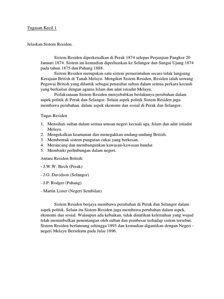 Tugas Residen British Di Tanah Melayu : Sebelum pembentukan malayan union pada tahun 1946.. Seperti di india atau di negara kita. Sistem ini diperkenalkan oleh british di senua residen bag setiap negeri dikekalkan dan menjalankan tugas seperti dahulu tetapi mesti melaksanakan arahan yang dikeluarkan oleh residen. Ž bermula dengan perjanjian pangkor pada 20 januari 1874.sistem residen bererti pemerintahan british secara tidak langsung dan pengawasan penjajah inggeris dilaksanakan melalui institusi politik yang sedia ada. Kesan penjajahan inggeris terhadap ekonomi orang melayu. Berbahasa inggeris dan sekolah berbahasa melayu.